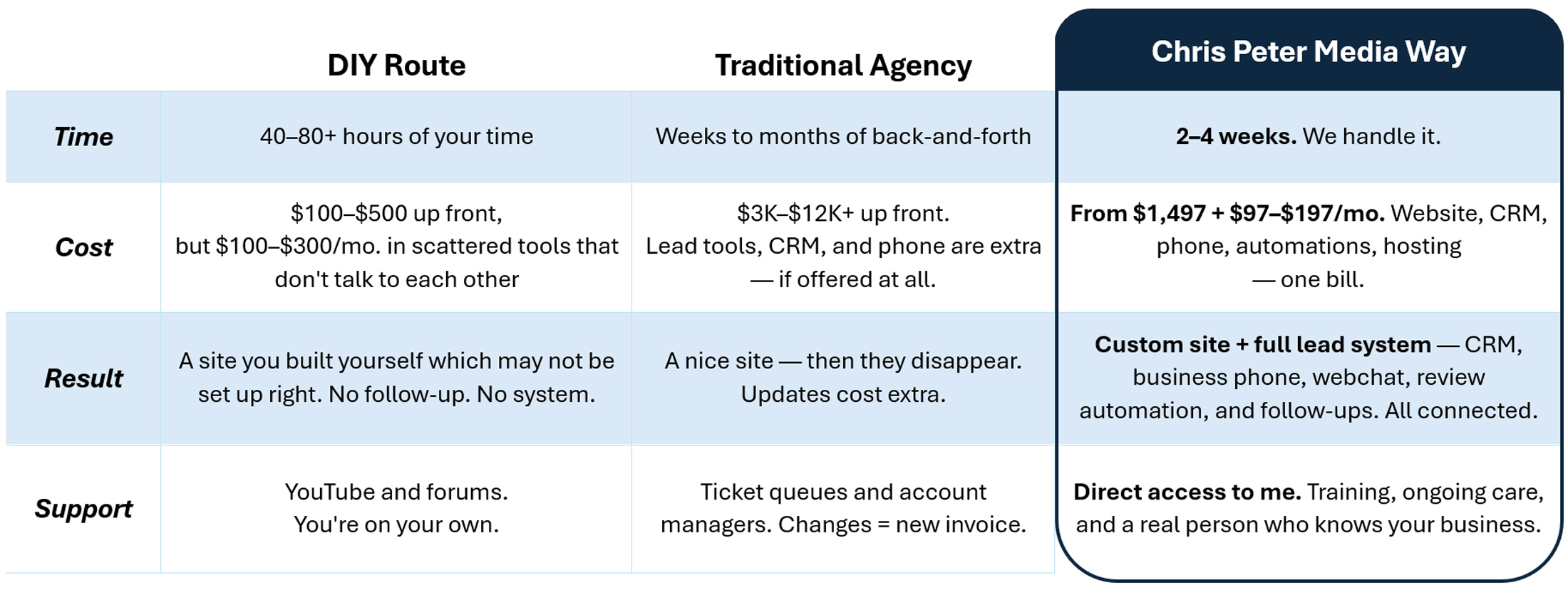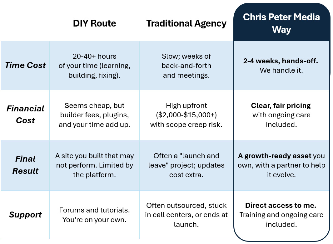 I started Chris Peter Media to give service business owners a clean, affordable website option that still feels premium. The goal isn’t just to “get a site live” but to build the kind of foundation your business can grow on, so your marketing, referrals, and social presence actually work better over time.