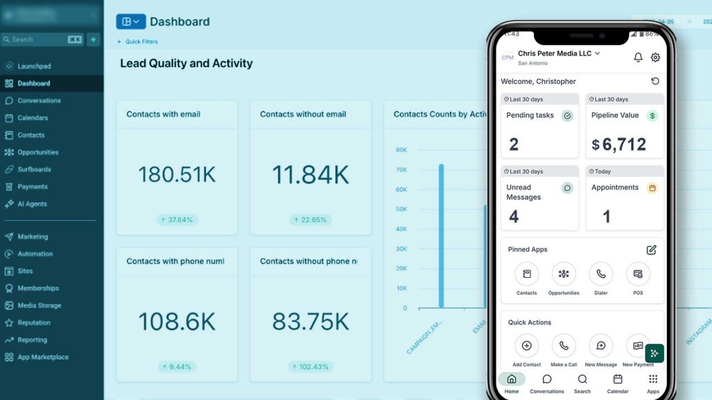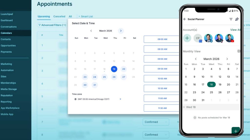 Need to book consultations or estimates? Built-in scheduling lets customers book right from your site. Want to plan social media posts? There’s a scheduler for that too. As your business grows, the system grows with you — email campaigns, invoicing, reporting, and more are all inside the same platform.