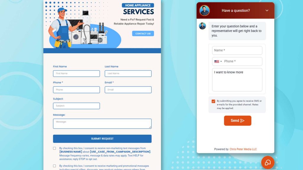 A chat widget on your site that routes straight to your phone — respond from an app, even from the field. Plus advanced intake forms that capture exactly what you need and feed directly into your CRM. No generic contact forms that go to an email you forget to check.